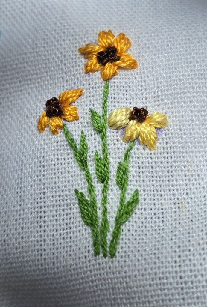 Caule e folhinha com a mesma linha perlé mescla das demais flores. Na Flor foi usado linha mescla Variations amarela número 4075.