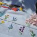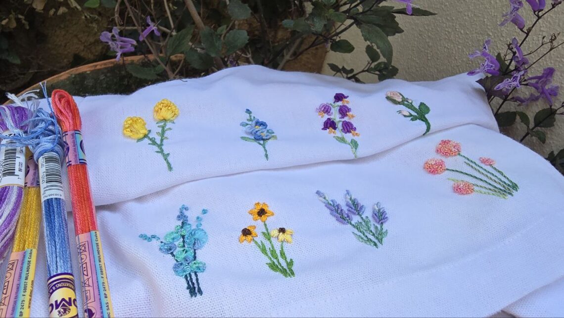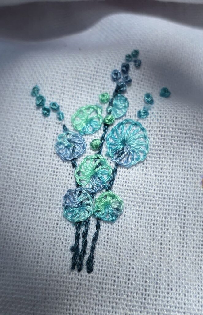 Caules e folhas em Perlé mescla tingida a mão por Alessanda. Flores em cor Roxa com linha Anchor mescla cor 1209. ou se preferir pode usar a DMC SpéciAL número 52. Para os pistilos com Anchor número 298.